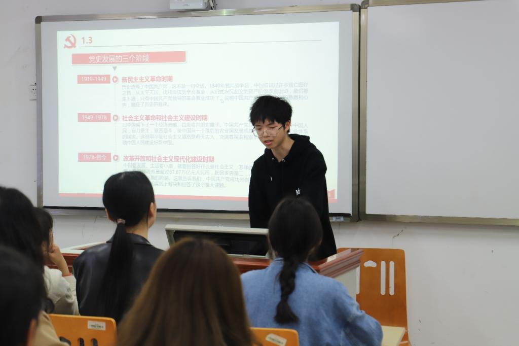 接着优秀团员代表刘家亮为全体同学讲解了中国共产党的发展历史及光辉成就。他从党史发展的三个阶段:“新民主主义革命时期、社会主义革命和社会主义建设时期及改革开放、社会主义现代化建设时期”全面回顾了中国共产党百年奋斗的光辉历史和历史性贡献。他引用习近平总书记的“历史是最好的教科书,中国革命史是最好的营养剂”这句话来激励同学们要勇于担当,做时代新人,牢记民族复兴的使命。