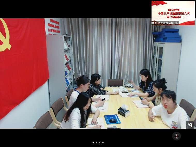 随后,丁欢书记带领大家进行中国共产党重庆市第六次代表大会精神专题学习。本次专题学习主要从中国共产党重庆市第六次代表大会基本情况和大会报告内容两方面开展。第一部分针对大会主题、大会议程作简短介绍;第二部分从“过去五年工作的回顾总结”“今后五年发展的思路目标”“今后五年工作的重点举措”“今后五年全面从严治党的主要任务”四个方面进行具体学习。最后,她强调教师党员、学生党员要深入学习政治理论,了解基本党团知识,提升自身综合素养;要不断强化理论武装,坚定理想信念,把会议精神贯彻落实到日常工作、学习中。