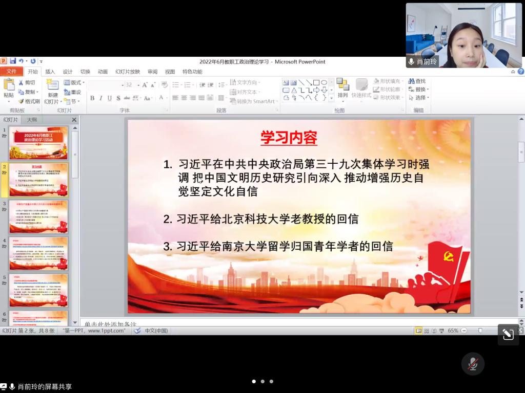 会上,肖前玲老师带领大家学习本期政治理论内容,主要包括习近平在中共中央政治局第三十九次集体学习时强调把中国文明历史研究引向深入推动增强历史自觉坚定文化自信;习近平给北京科技大学老教授的回信;习近平给南京大学留学归国青年学者的回信。她强调本次学习内容对高校教师发展具有指导性意义,教师应当心系国家事,肩扛国家责,培养更多“听党话、跟党走”的有理想、有本领的高素质人才。