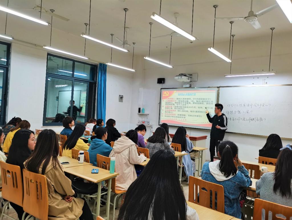 紧接着,王卓清从“申请入党”、“入党积极分子的确定和培养教育”、“发展对象的确定和考察”、“预备党员的接收”、“预备党员的教育考察和转正”五个方面向大家介绍了入党流程。同时,他带领同学们观看了《你,为什么要入党》短视频,并认真领学了入党誓词。