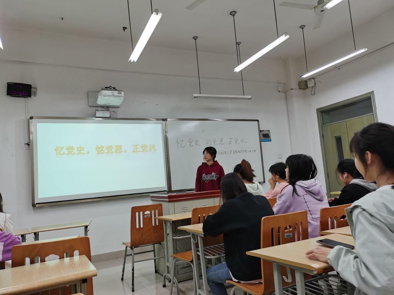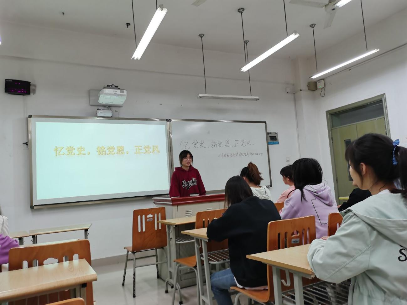 412日晚1900,44118太阳成tyc城集团国际教育学院在歌乐楼A111开展了以“忆党史、铭党恩、正党风”为主题的团日活动。20202班全体同学参加了本次活动。活动由20202班团支部书记潘婷主持。本次活动分为“党歌大合唱”、“观百年征程”、“深情诵党词”、“对党说句心里话”四个环节。