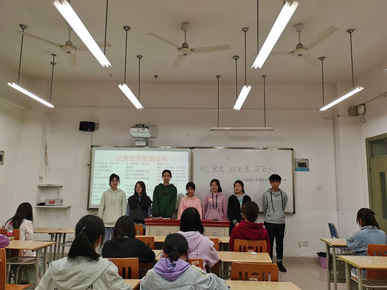 紧接着,由钟文茜、徐可睿、毛春芳等七位优秀团员为同学们带来赞颂我党的朗诵节目。优秀团员们深情朗诵,抑扬顿挫,感人肺腑,充分展现了当代团员热血沸腾的精神面貌,树立了积极的优秀团员形象。