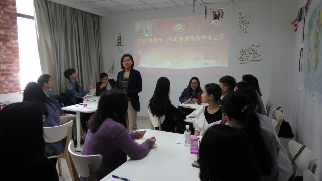 201747日中午12:30分,教育学院党总支教工党支部、研究生党支部以及本科生党支部所有师生党员在西区行政楼B404参加党课学习---专题学习习近平总书记在全国高校思想政治工作会议上的讲话。教育学院党总支副书记向蓉为党课主讲人。