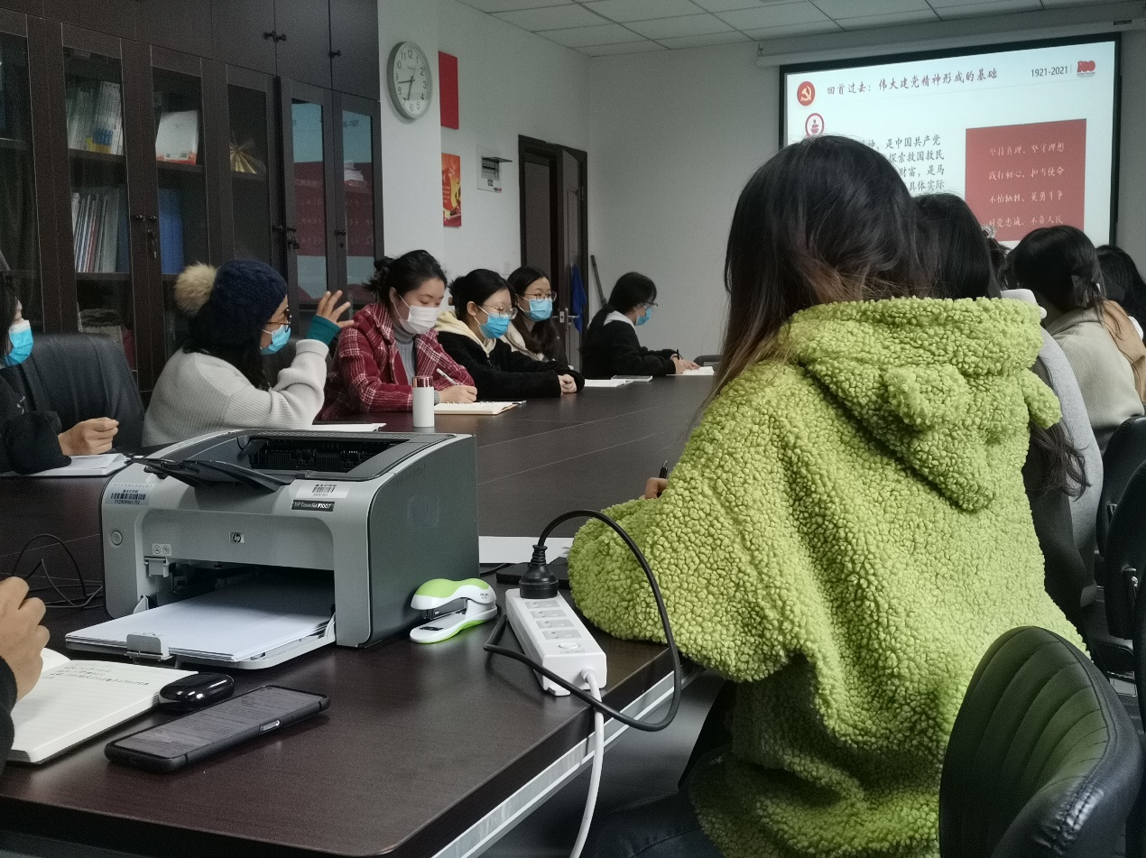 本次党日活动各位成员认真学习、互动、做笔记,积极思考领悟。在听完丁欢书记的讲解后,与会成员对习近平总书记在庆祝中国共产党成立100周年大会上发表的 “七一”重要讲话精神有了更加生动且深刻的学习和认识。回首过去,立足当下,展望未来,弘扬伟大建党精神,赓续百年红色血脉,中国青年即将踏上新的征程,向着全面建成社会主义现代化强国的第二个百年奋斗目标迈进,必须弘扬伟大建党精神,用伟大建党精神滋养党性修养,坚定理想信念,努力创造无愧于党、无愧于人民、无愧于时代的业绩!