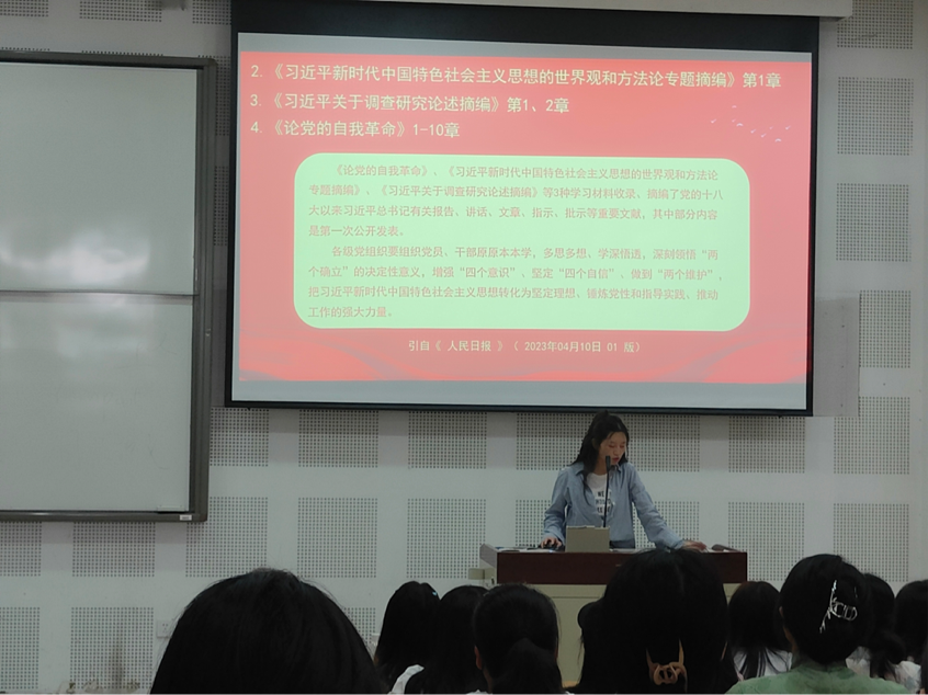 在“学习贯彻习近平新时代中国特色社会主义思想主题教育内容”方面,李爽通过展示《习近平新时代中国特色社会主义思想专题摘编》、《习近平关于调查研究论述摘编》、《论党的自我革命》等党的著作,向参会的党员、预备党员、发展对象和积极分子讲述了“四个意识”、“四个自信”、“两个维护”的详细内容,明确了习近平新时代中国特色社会主义思想的工作方向。