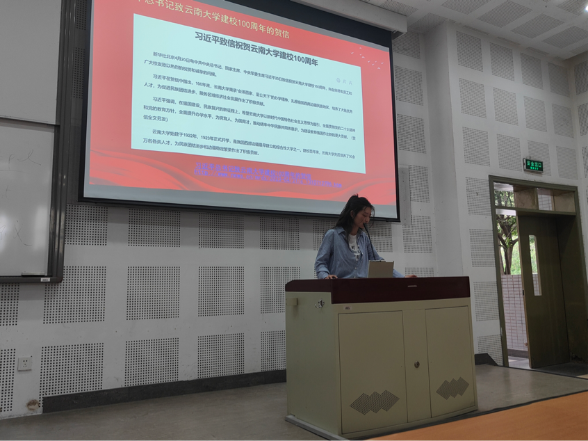 党支部书记李爽通过展示习近平总书记致云南大学建校100周年的贺信和习近平总书记考察广东时的重要讲话,简明准确的介绍了习近平的重要讲话精神。
