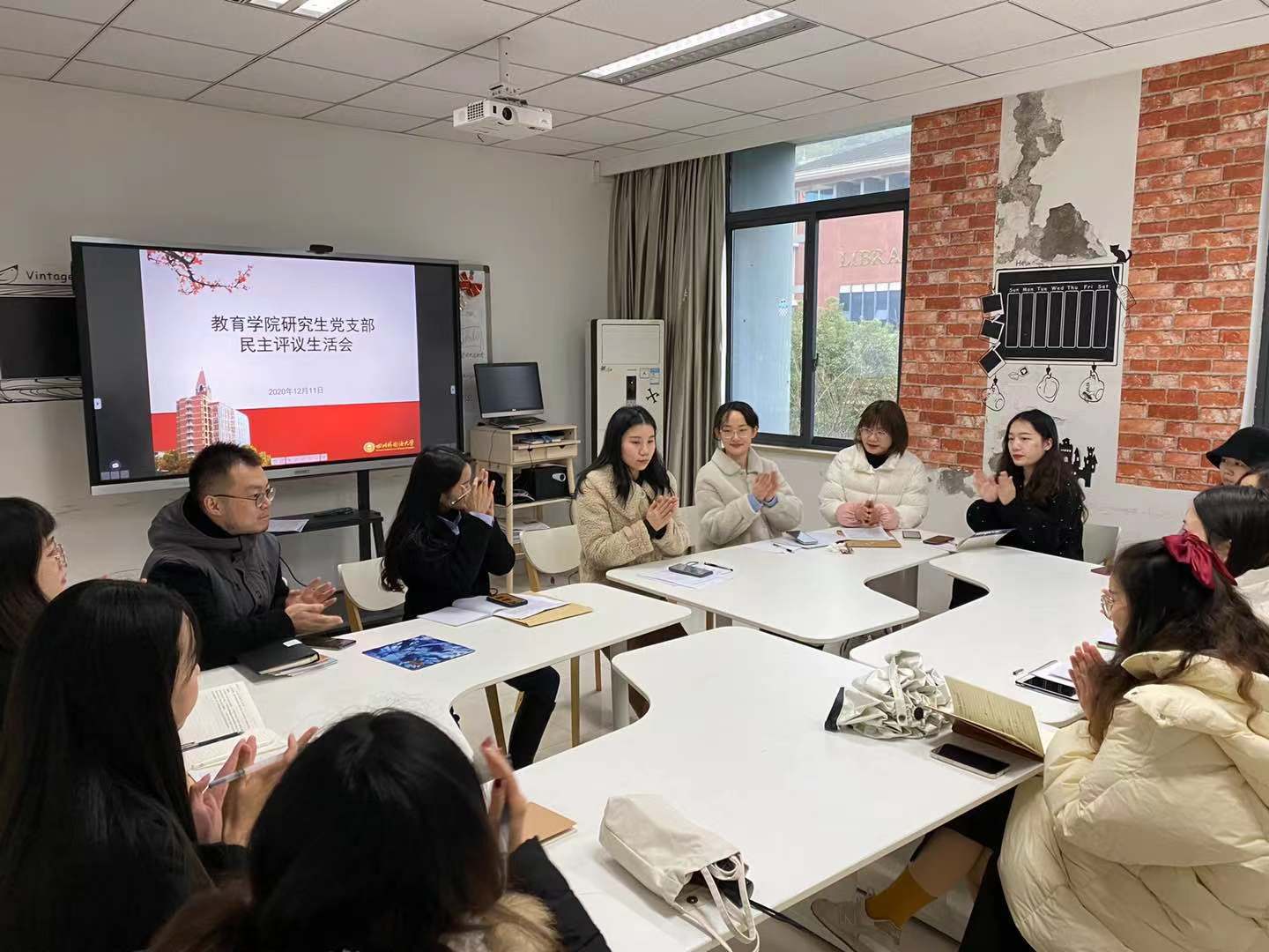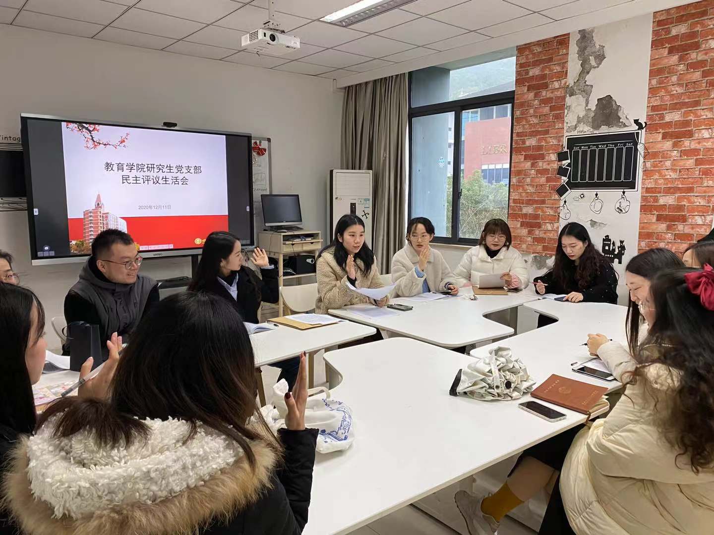 2020年12月11日下午,教育学院研究生党支部在行政楼B-404顺利开展了12月份主题党日活动。参加会议的有在校研究生党员及预备党员。本次活动的主题是:讨论及表决袁晨迪、韦东蜀、刘勇同志的转正情况;复习《习近平谈治国理政》第四卷内容。