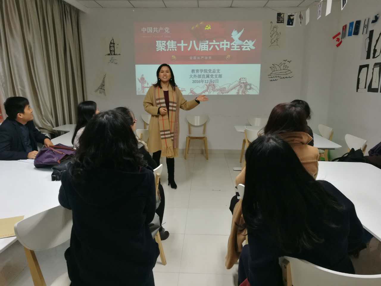 2016年12月2日,教育学院教工支部全体党员、大外部直属党支部全体党员在办公楼B404集中召开了党的十八届六中全会精神学习会,本次党课由教育学院党总支副书记向蓉讲授。