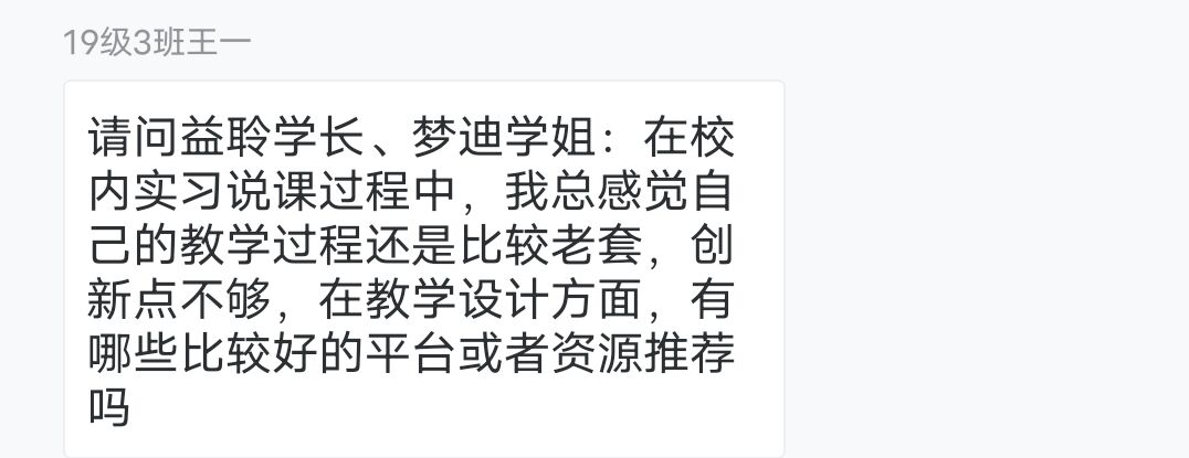 接着,张益聆与学弟、学妹们分享了实习相关的经历他结合自己的实习经历谈到:一是实践、实习和书本学习到的理论知识存在一些差异,绝知此事要躬行;二是课堂教育、教学过程中定会遇到各种各样的突发情况,要建立预警机制,灵活应对;三是日常管理也是教育的一部分,要学会“教”“管”结合。