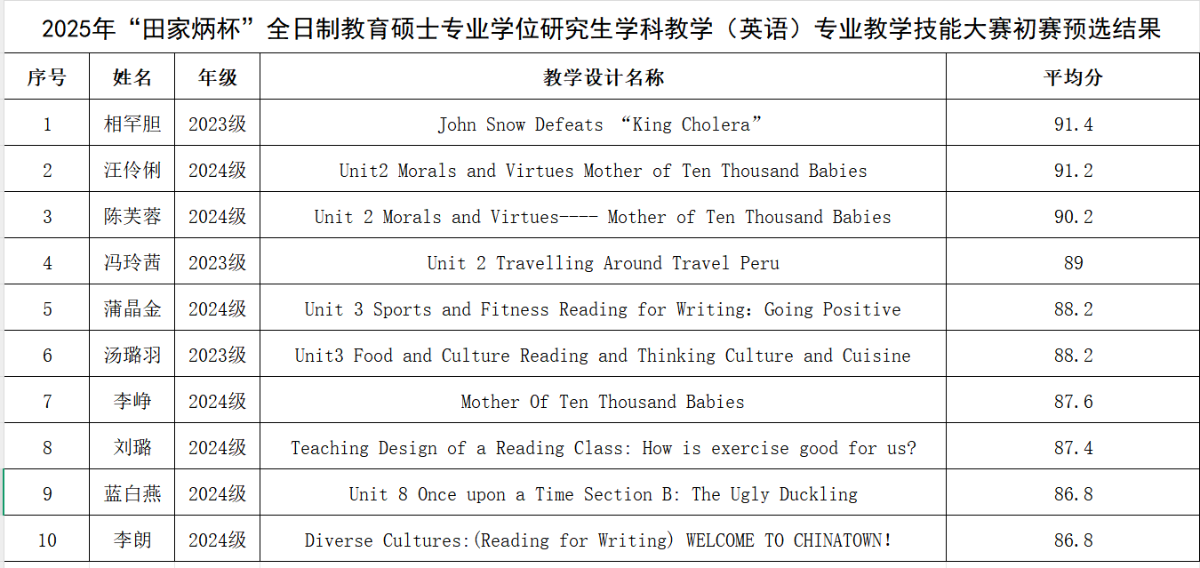 根据《2025年“田家炳杯”全日制教育硕士专业学位研究生教学技能大赛章程》要求,经专家评审组严格评审,现将学科教学(英语)专业初赛预选结果公示如下: