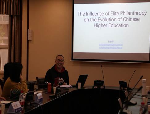 孙贵平博士报告的主题是“中国高等教育精英慈善捐赠的影响因素分析”。他通过与美国名人捐赠数据的对比,以及三个国内捐赠案例对比,得出了社会慈善的重要影响性以及吸引外部捐赠的必要性。王鲁男教授,龙洋副教授以及其他老师就孙博士的报告发表了自己的看法。龙洋副教授认为从学术报告角度来看,孙博士的报告比较精彩,覆盖面广。方晓田副教授认为孙博士提出的“中国精英慈善捐赠”这个理论具有重要价值。