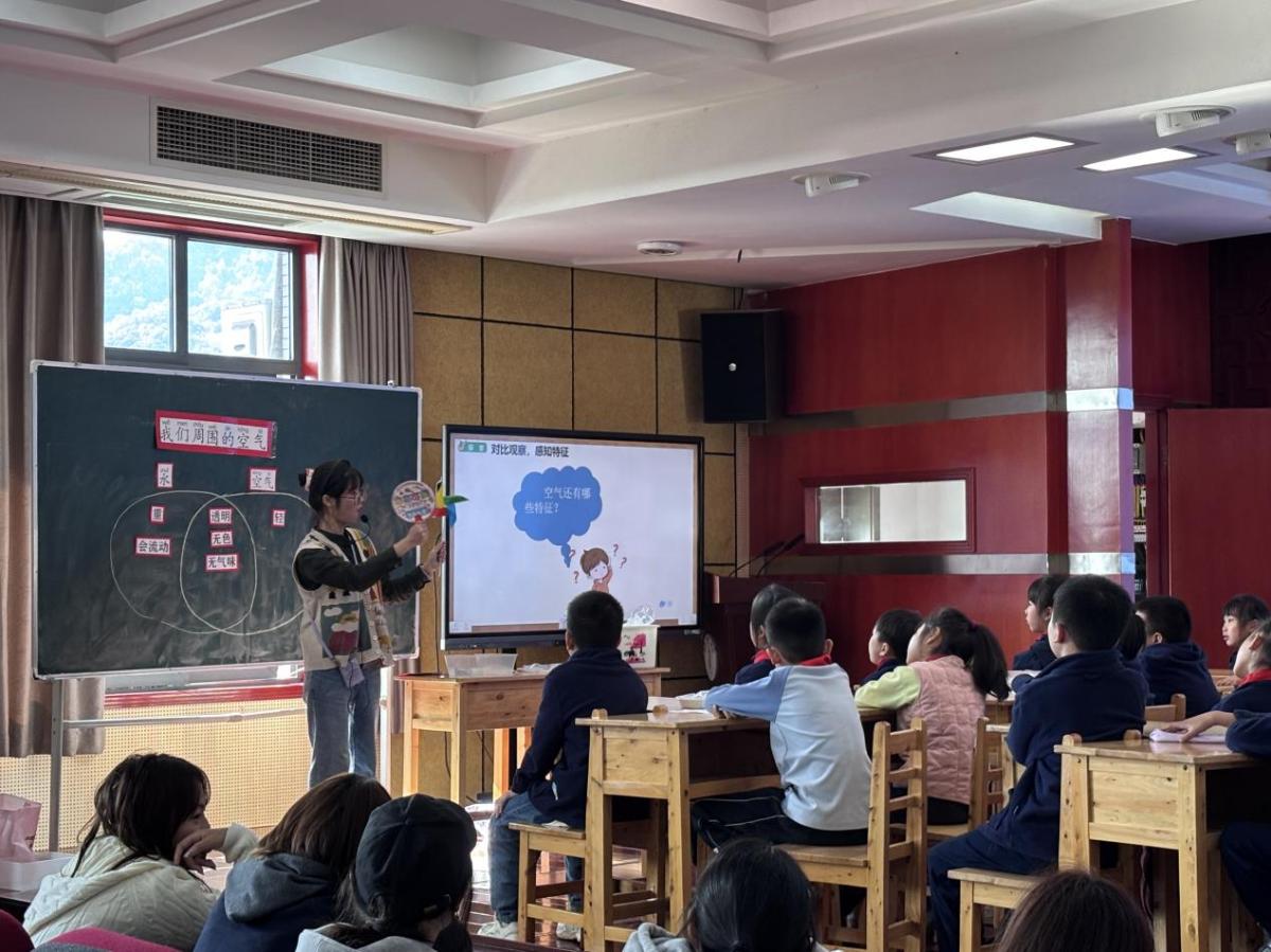活动伊始,新桥小学周老师以《我们周围的空气》为题,展示了一堂生动有趣的科学公开课。课堂教学按照观察感知实验对比体验感受总结建议的逻辑展开:首先,让学生们猜黑色袋子里是什么并给出理由,最后揭秘真相;接着,让同学们四人为一组收集空气,对比水和空气的特征,总结水和空气的异同点,培养科学探究思维;在体验感受环节,学生们跟着视频呼气与吸气并举手表达自己的感受,认识到空气的重要性;最后,周老师通过播放短片引导学生思考如何保护空气朋友”。