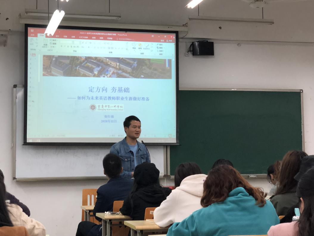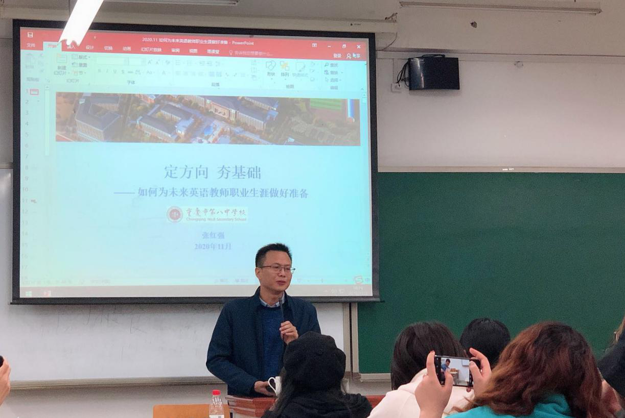 2020年11月3日下午,44118太阳成tyc城集团教育学院在西区教学楼B203举办了“如何为未来中学英语教师职业生涯做好准备”的专题讲座。该讲座特邀重庆基础教育名校——重庆第八中学的优秀英语教师、高中英语备课组长张红强老师主讲。教育学院研究生导师代表、全体研究生部分本科生参加