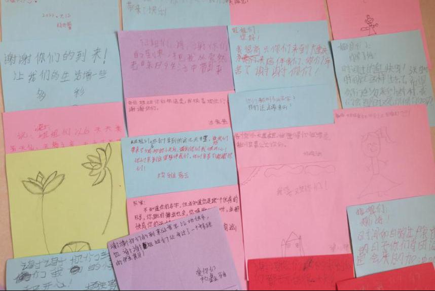 夜幕降临,实践团成员们组织同学们围成一个圈,一同参与“桃花朵朵开”的游戏。活动即将结束之际,平所村小的同学们认真地写下了想对实践团成员说的话,纸短情长,一字一句都表达了对团队成员的喜爱与感谢。