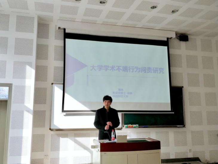 2018年3月8日16时整,西区教学楼B2-2教室举行了以“大学学术不端行为问责研究”为主题的讲座。本次讲座学院有幸邀请到了陕西师范大学教育学博士陈亮老师作为主讲人,教育学院副院长龙洋老师、教育学院任课老师龚洪老师、郑秀敏老师以及辅导员李刚老师作为代表出席了本次讲座,教育学院2016、2017级的同学也参加了本次活动。