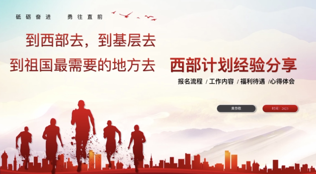 其次,黄恭敬学长对西部计划的福利待遇进行了介绍,详细讲解了西部计划的工资待遇、工作时间、政策福利和其他福利。从同学们最关心的工作时间、薪资待遇等方面一一为同学们作了解答。黄恭敬学长分享了自己参与西部计划的心得体会。学长认为,西部计划是突破心智、自立自强、学习深造和不断实践的良好机遇。