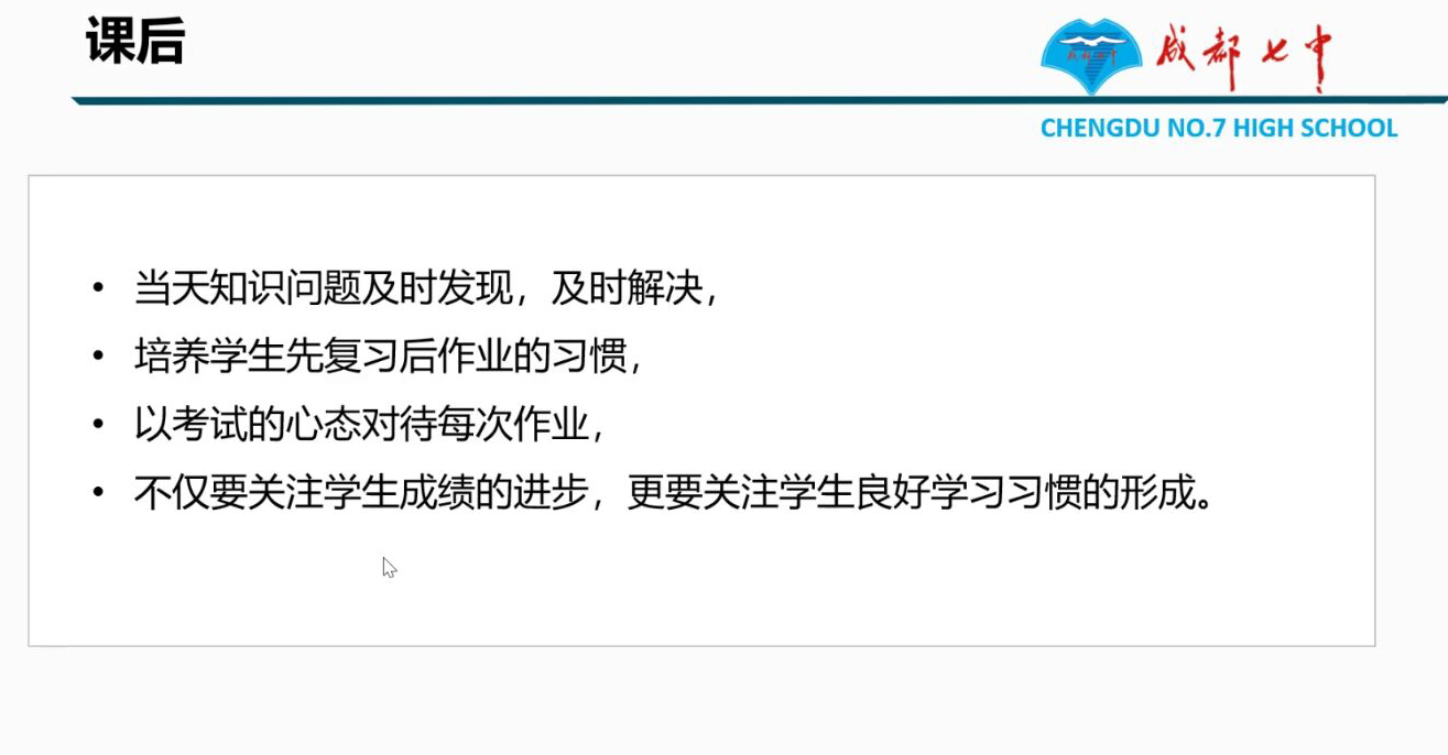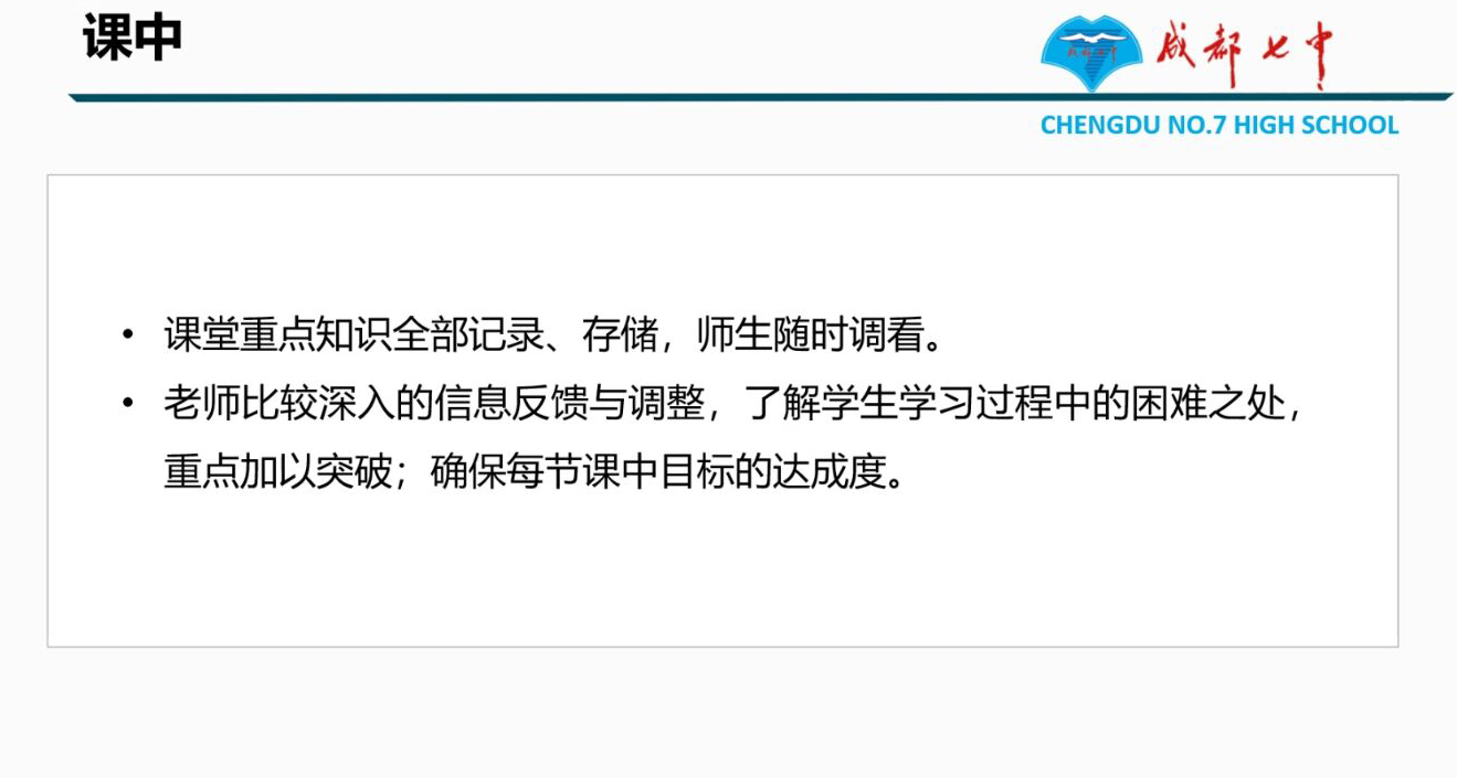接着,谢朝富老师简要介绍了成都七中的发展情况,结合当前信息技术飞速发展的时代背景,与同学们分享了成都七中当前的远程直播教学模式前端主要是由成都七中老师完成课堂主讲,远端学校观看视频,并通过线上平台完成对学生的个性辅导,最终达到异地同堂教学效果。这种直播教学取得了显著成绩,合作规模不断扩大,并且这种教学模式也吸引了大批人员关注,如:米歇尔·奥巴马女士对此教学模式表示十分认可
