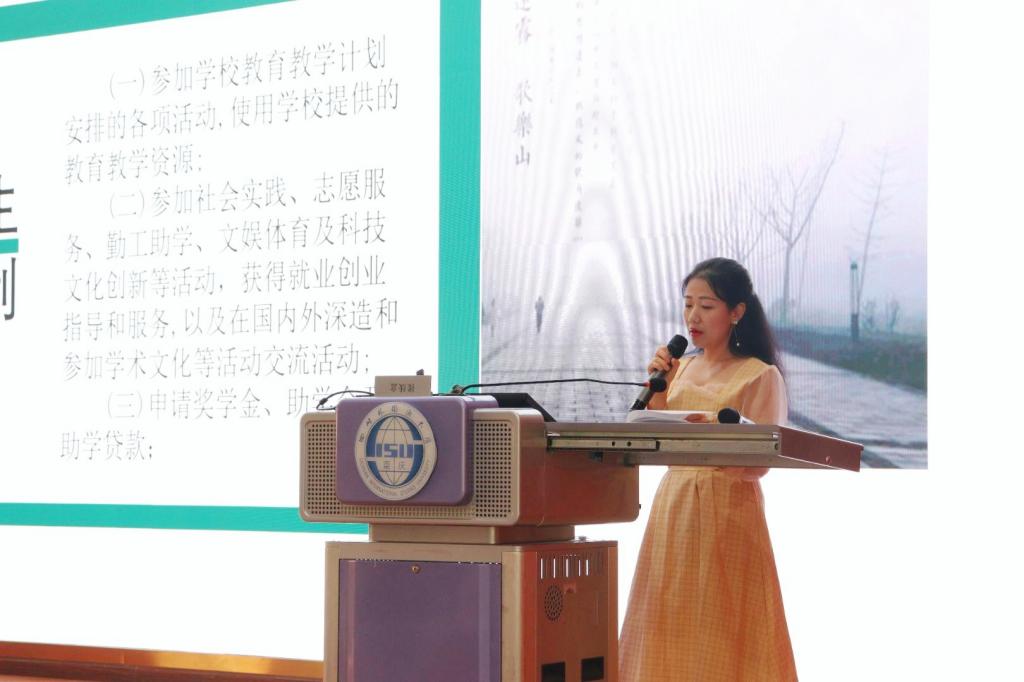 首先黄书记分别从学籍管理、课程考核方式、成绩评定与记载、课程免修与缓考、学业学分清查、考试行为管理以及转专业管理办法等方面,对学校的学生管理手册以及学生管理方法进行了讲解,强调了其严肃性和重要性,要求全体学生要认真学习并严格遵守。其中,她重点强调了三个方面的内容。一是学生的权利和义务。作为学生,大家要首先明确自己的权利与义务,正确行使权利,自觉履行义务。同时黄书记也提到了志愿服务和社会实践活动,鼓励大家多多参与,促进自身综合素质的提升;二是学籍管理规定。她从“学习纪律”、“选课”、“考核与成绩记载”等内容为同学们明确阐述辅修学科的优势以及违纪考核的处理方法,希望大家能够规划好大学生活的同时还要严格要求自己三是规则意识通过详细的举例,她希望大家明确规则是维护社会稳定的基础,还要遵守智者的三个标准,做到懂规则、守规则还要善用规则,最后成为生活的智者。