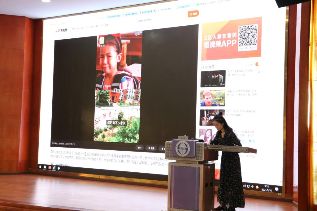 紧接着尹梓君上台向大家分享,首先她用两段视频向大家分享了研究生支教团的故事然后以文字和图片混合的方式展示了她的支教日记,讲述了她支教一年生活的巨大收获,她说支教是用一年的时间来做让自己一生难忘的事情。最后她希望同学们能做一个有爱心、耐心、责任心的老师,希望大家能带领着自己的学生在读书中学会做人,在做人时懂得规则,在规则中懂得敬畏,在敬畏中不负生命。
