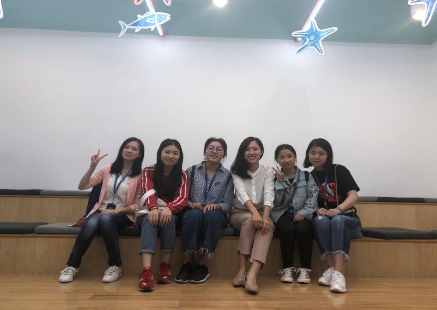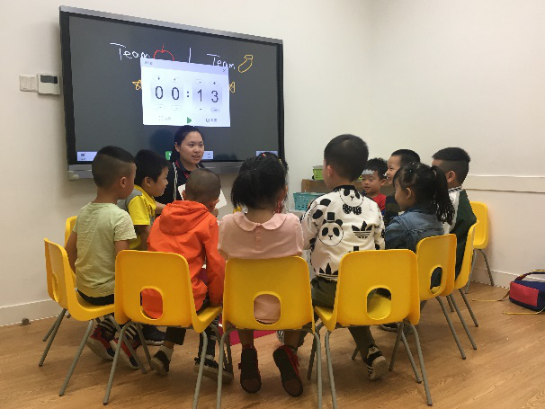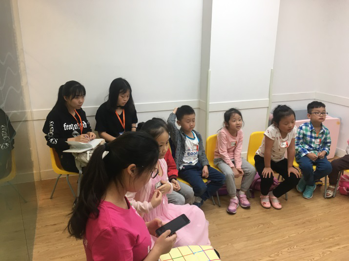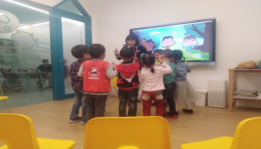 为了让大家能够全面地了解针对不同年龄段儿童进行的教学内容以及教学模式几位同学被分为三组,分别去往不同年龄阶段的教学课堂。一节课的大概流程是这样的:通过一段简单基础的英文视频,让孩子们跳舞来活跃气氛,热完身后,孩子们踊跃举手用英文介绍自我。通过有图画,有单词的卡片来复习上节课的内容。接下来,老师们通过用肢体语言,动画的课件视频以及带图画的卡片带领孩子们学习新的单词与知识,最调动气氛的是,老师会让孩子们在学习完新单词之后将课本上的图片与单词匹配,然后将一节课的分数总结奖励给孩子们贴纸,最后的一步是孩子们在goodbye这样一首简单的英文歌中有秩序的离开。在这样的英语教学中,孩子们既学习到了英语知识,也收获了快乐。同学们发现,根据不同的发展水平,英孚少儿英语为儿童们设计了符合他们年龄特点的课程。例如:SSBlue的课程中数数字时老师会让大家数手指辅助;而SSC的小朋友甚至可以根据前面的动画短片给卡片排序。