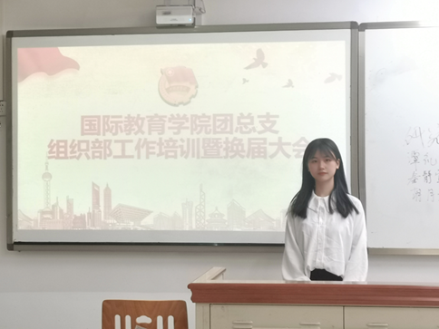 接着,两位部长在会议上宣读新一届团总支组织部、宣传部干部名单。彭恩莲同学担任国际教育学院团总支组织部部长,刘茉同学担任国际教育学院团总支宣传部部长。