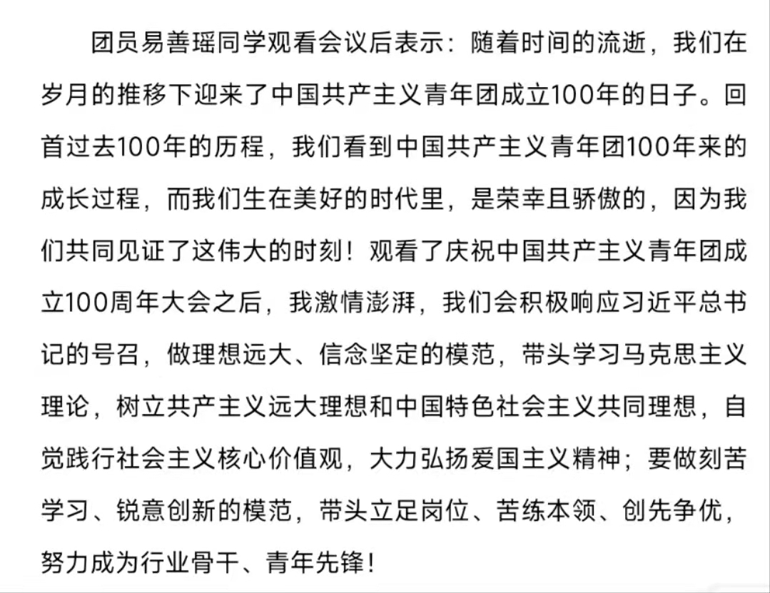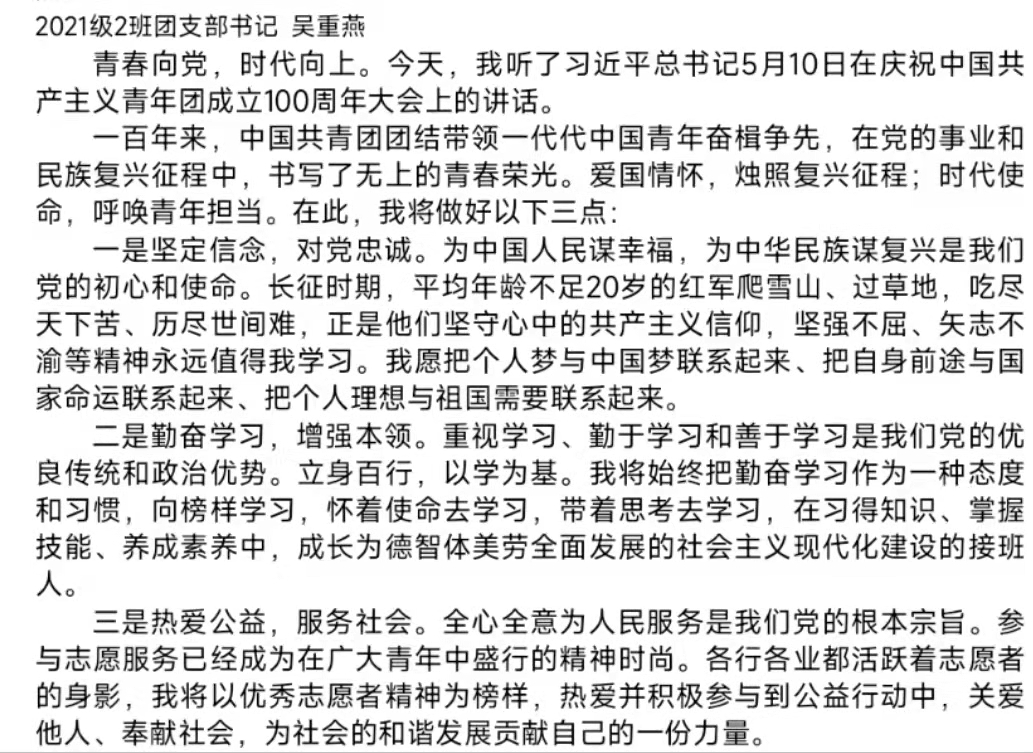 百年征程浩荡,百年初心如磐。今年是中国共产主义青年团成立100周年,一百年栉风沐雨,中国共产主义青年团始终坚定不移跟党走,团结带领广大青年前赴后继、勇当先锋,书写了中国青年运动的华章。中国共产主义青年团是中国共产党领导的先进青年的群团组织,是广大青年在实践中学习中国特色社会主义和共产主义的学校,是中国共产党的助手和后备军,是党联系青年的桥梁与纽带,也是党和人民事业的主力军和突击队。习近平总书记在大会上对青年表达了高度赞赏,并寄予了殷切期望。同学们通过撰写青年热议信息的方式,表达了自己对青年精神、共青团精神等的领悟与感想,并将深入贯彻习近平总书记重要讲话精神,展现爱党向党之心与青年之朝气蓬勃。