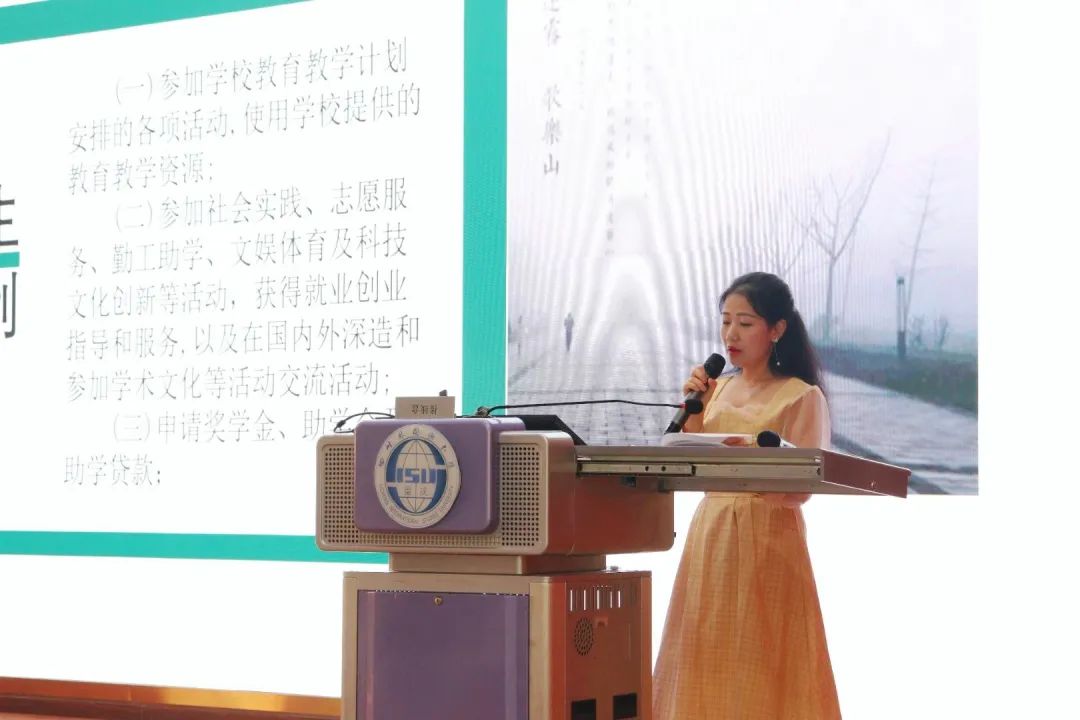 首先黄茜副书记分别从学籍管理、课程考核方式、成绩评定与记载、课程免修与缓考、学业学分清查、考试行为管理以及转专业管理办法等方面,对学校的学生管理手册以及学生管理方法进行了讲解,强调了其严肃性和重要性,要求全体学生要认真学习并严格遵守。其中,她重点强调了三个方面的内容。一是学生的权利和义务。作为学生,大家要首先明确自己的权利与义务,正确行使权利,自觉履行义务。同时黄书记也提到了志愿服务和社会实践活动,鼓励大家多多参与,促进自身综合素质的提升;二是学籍管理规定。她从“学习纪律”、“选课”、“考核与成绩记载”等内容为同学们明确阐述辅修学科的优势以及违纪考核的处理方法,希望大家能够规划好大学生活的同时还要严格要求自己;三是规则意识。通过详细的举例,她希望大家明确规则是维护社会稳定的基础,还要遵守智者的三个标准,做到懂规则、守规则、还要善用规则,最后成为生活的智者。