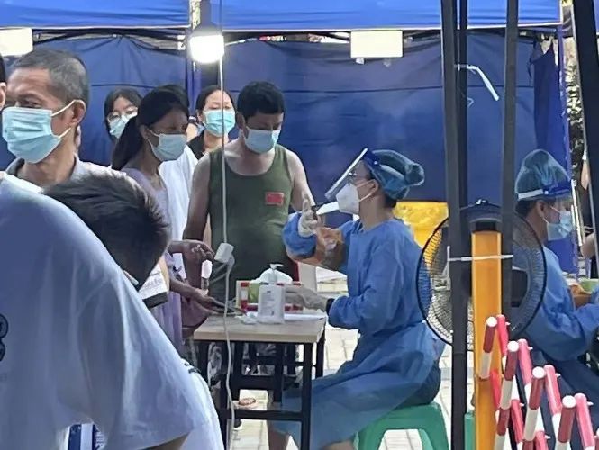 第一次穿上全套防护服,在高温下很快就汗流浃背,第一次戴上橡胶手套,我从未想象过这个手套会戴着如此不适,不一会手套里就满是水。现场人员的组织秩序对大规模的核酸检测很重要,每一个环节都不能出错。二十个人一组混检,只要发现样本少了之前做过的所有人就要重新做一次。我采集的时候就出现了这样的问题,只能一个个打电话让他们重新做。中途还会有民众关心问我坐在这里是不是很热,对我说上一句谢谢,让我十分感动和知足。这次的志愿工作我收获颇多,对医护工作人员心生更多的感激和敬意。