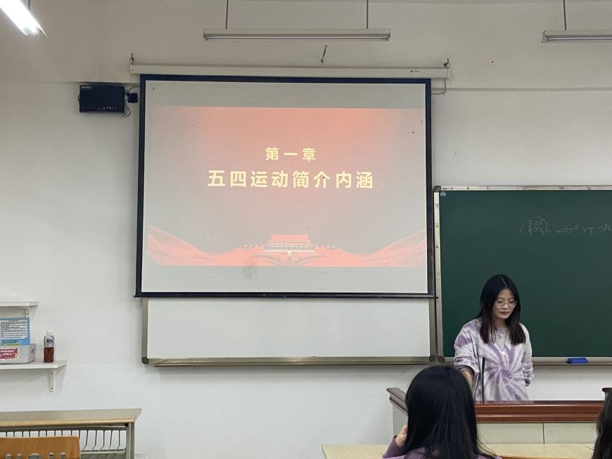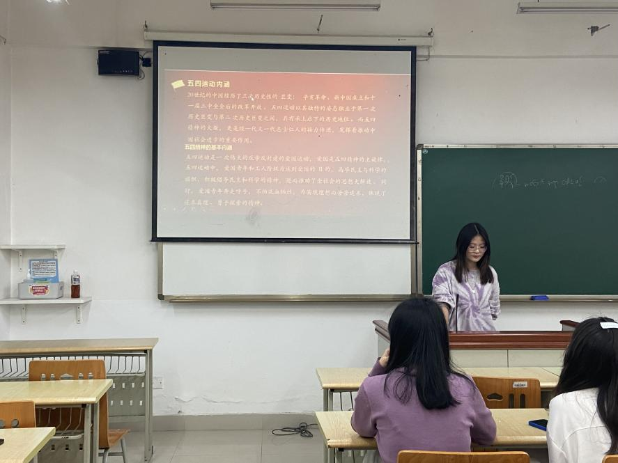 首先,苟静雯向大家讲解了“五四运动”的历史背景、爆发原因、以及主要经过。“五四运动”是一次伟大的反帝反封建的爱国运动,爱国是“五四精神”的主旋律。“五四运动”中,爱国青年和工人阶级为保卫国家,高举民主与科学的旗帜,积极倡导民主和科学的精神,进而推动了全社会的思想大解放。同时,爱国青年奔走呼号,不怕流血牺牲,为实现理想而苦苦追求,体现了追求真理、勇于探索的精神。