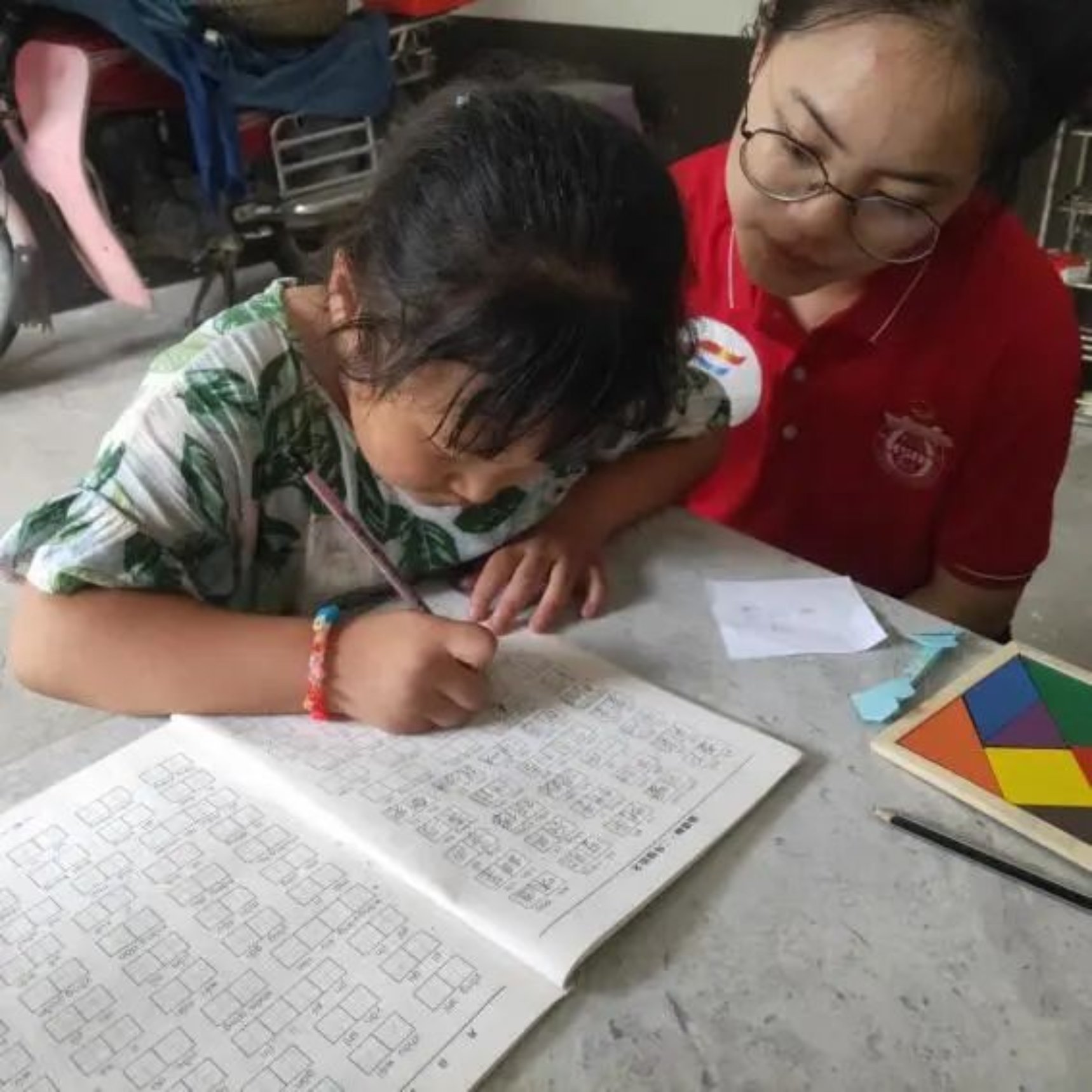 下午的剪纸活动结束之后,志愿者们来到了社区居民的家里中,对小朋友们进行了针对性的暑假作业辅导。根据启发性教学原则,在辅导作业的过程中,志愿者们不仅耐心地为小朋友们提供解题方法,同时注重培养他们独立思考的能力。孩子们也听得十分认真,遇到不懂的问题积极请教。在每家小小的方桌前,孩子们和志愿者们热烈地讨论作业里的难题。当疑问被解决、难题被攻克时,志愿者们被孩子们脸上洋溢的灿烂笑容深深打动。通过作业辅导,志愿者们和孩子们之间的交流和联系也进一步加深,志愿者们鼓励小朋友们努力学习,发奋图强,将小我融入大我,将自身的理想融入国家的理想,共同为美好生活、国家发展努力奋斗。